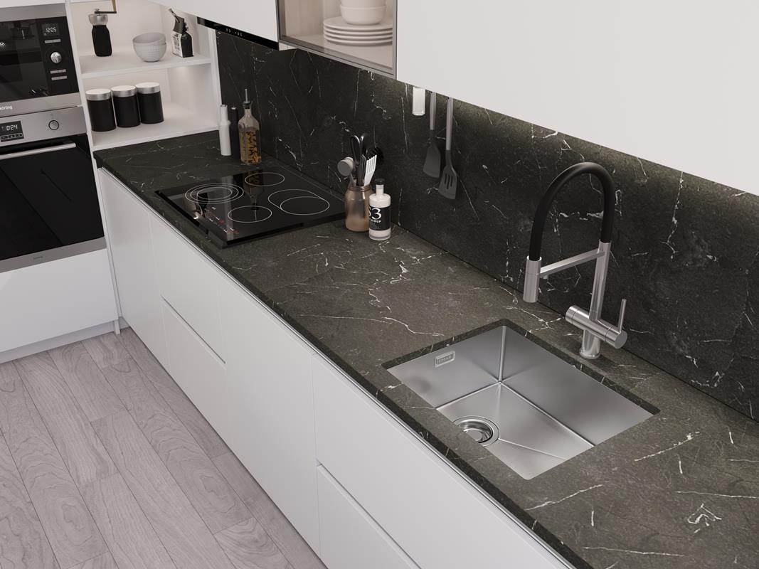 Данная модель выполнена со смещённым сливным отверстием и является оборачиваемой. Смещенное сливное отверстие позволяет более эффективно использовать рабочую поверхность, и увеличивает свободное пространство под мойкой.