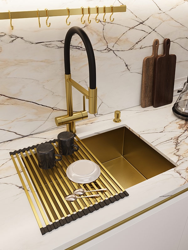 Материал Нержавеющая сталь и черный силикон Назначение Для кухонной мойки Цвет Gold Тип Ролл-мат Исполнение Квадратный пруток Размер 440 x 330 мм