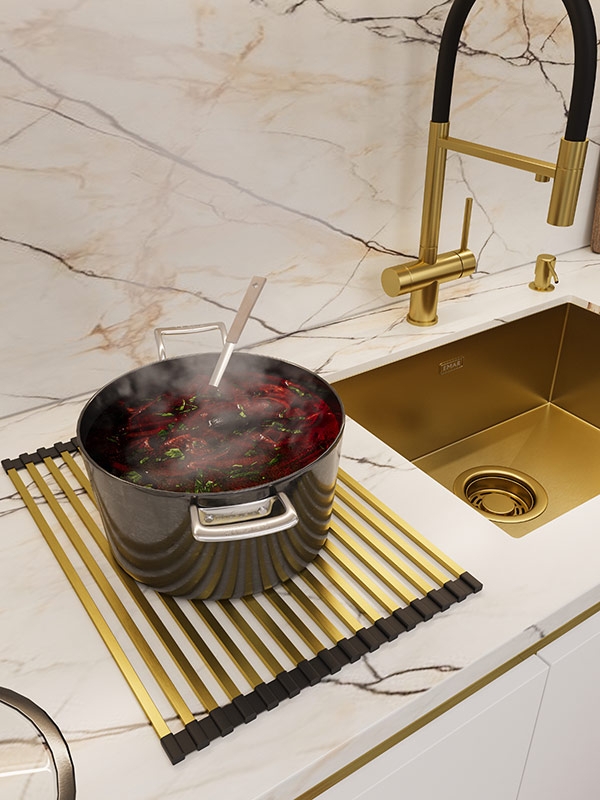 Стильные коврики «Ролл-мат» расстилаются на кухонных мойках или на столешнице. Используют для сушки овощей, посуды, а также для размещения горячих кастрюль и сковородок.
