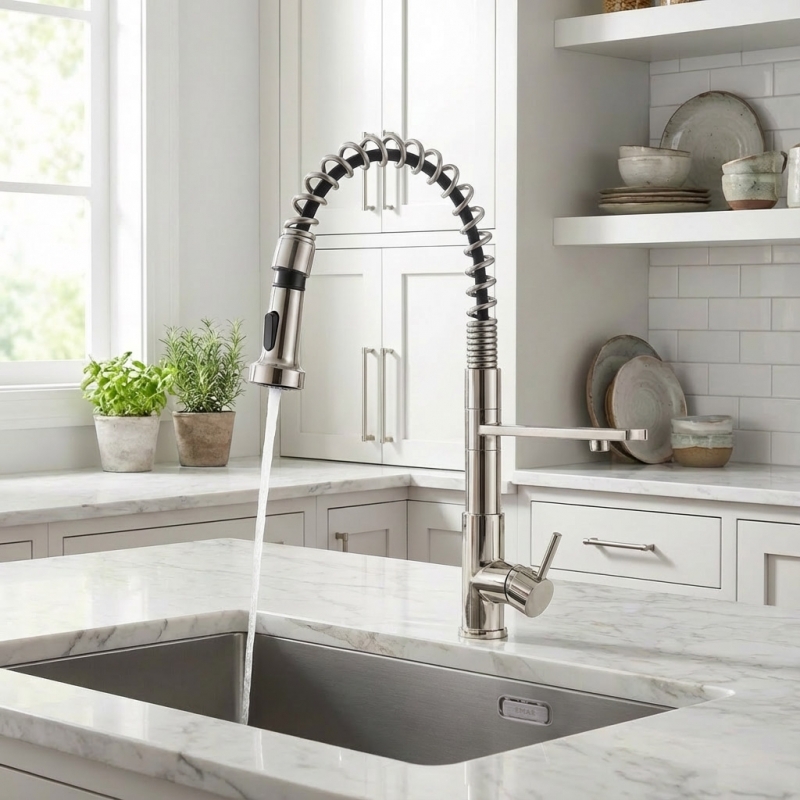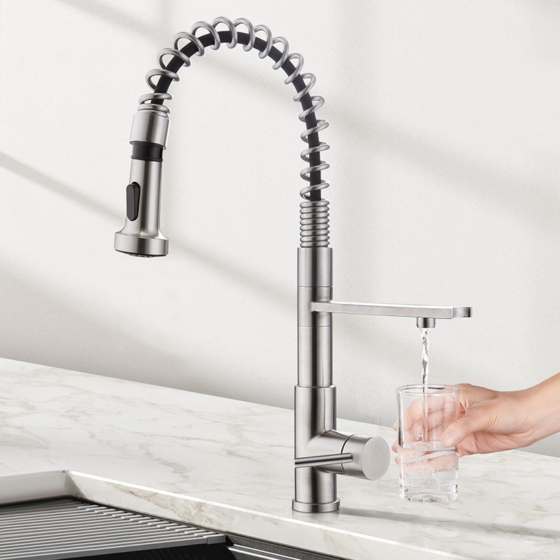 Кухонный смеситель с возможностью подключения фильтра для очистки воды. Фильтрованная вода подается через отдельную трубку и не смешивается с водопроводной водой.