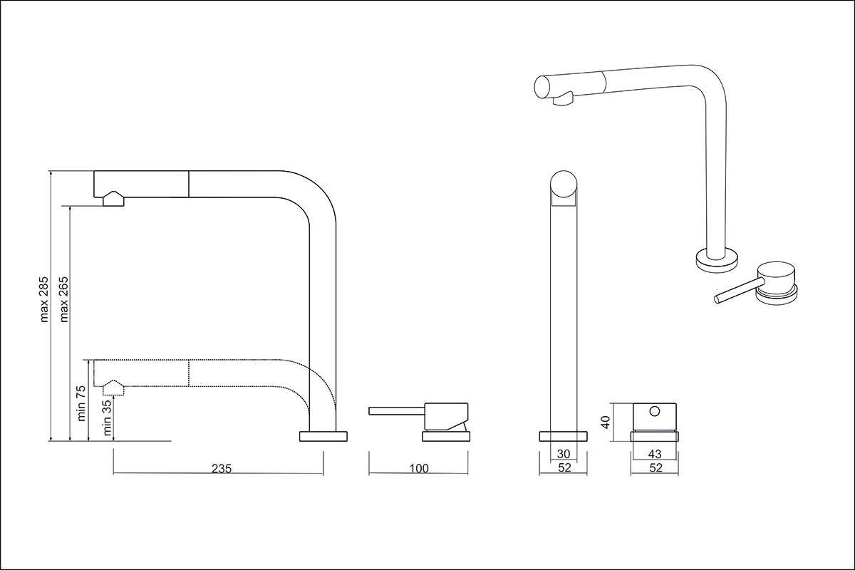 • Высота смесителя: регулируемая (max 285мм / min 75мм)